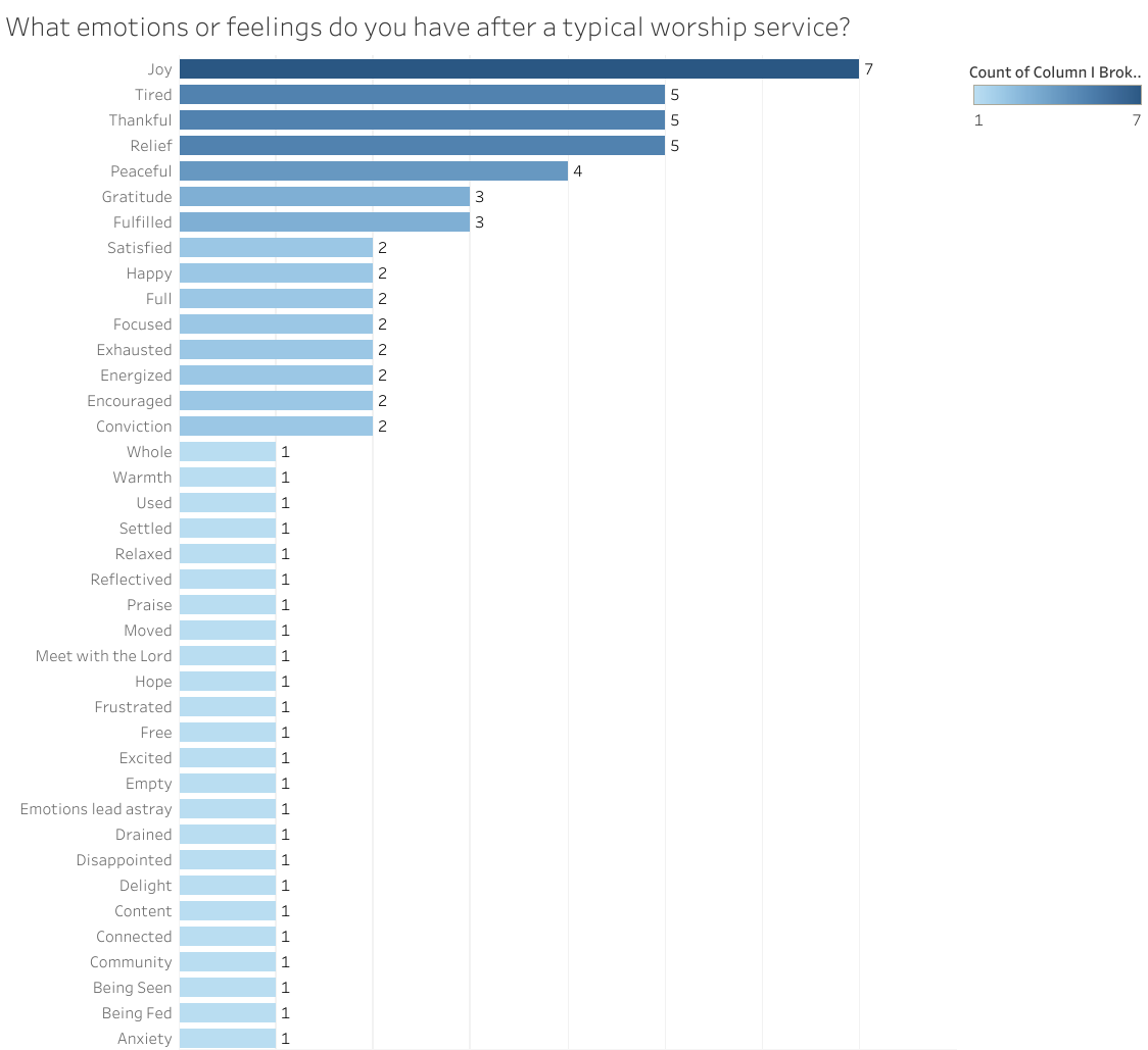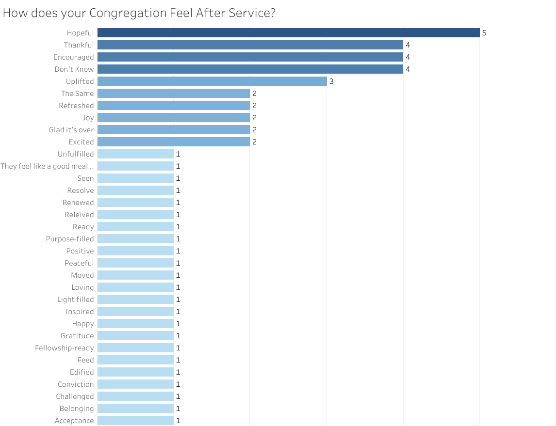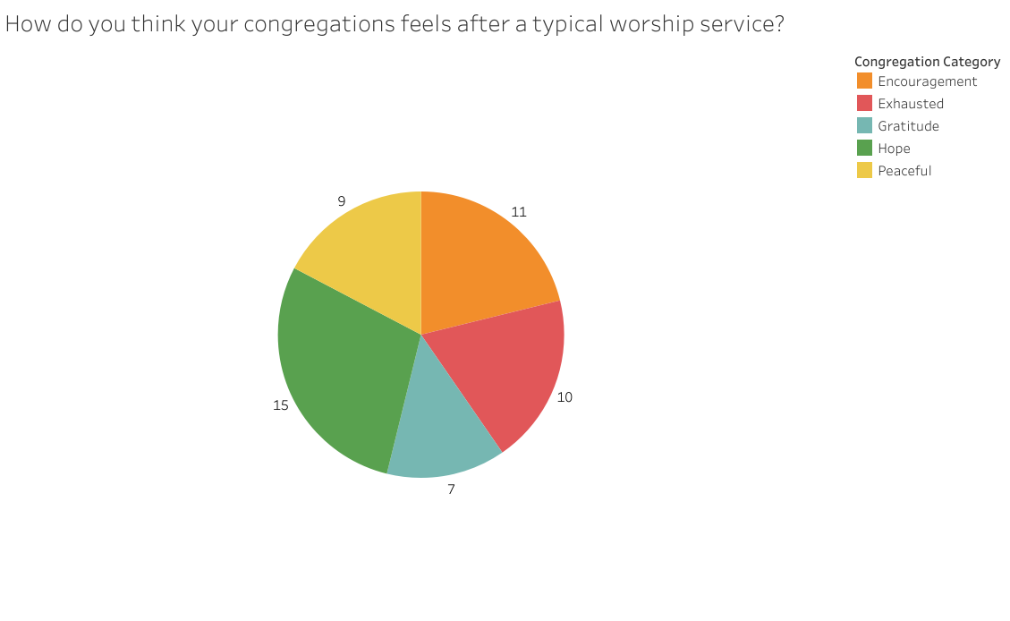 As a follow-up question, I asked the leaders how they thought their congregations felt after worship. Almost half of the respondents answered that their congregations felt Hopeful, thankful, or encouraged after the service. When you add an interpretive lens to better categorize the responses together, 9 say peaceful, 11 leaders say that their congregations feel encouraged, and 15 say hopeful.