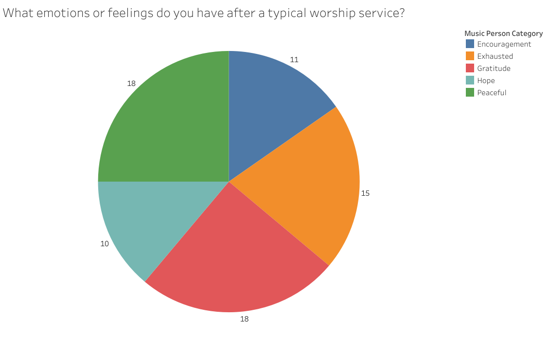 The comments typically include statements such as "I would hope they would feel," "I think they feel," or "I have the impression that the congregation feels a certain way after the service." Some worship leaders have mentioned that they do not know or are uncertain how to answer this question. From reading the comments and listening to the worship leaders I have interviewed, it seems there is not always an effective system for leaders to obtain feedback about the service unless it involves complaints about singing too many hymns or praise and worship songs, or not singing the song that attendees preferred on that day. One leader mentioned that the “Main feedback is usually personal preference stuff (which they usually realize is them) or technical stuff that needs taking care of” and the rest of the leaders who spoke about congregational feedback echoed that sentiment. The other repeated feedback is a vague thanks or good job, but it is rare to hear detailed and in-depth comments.