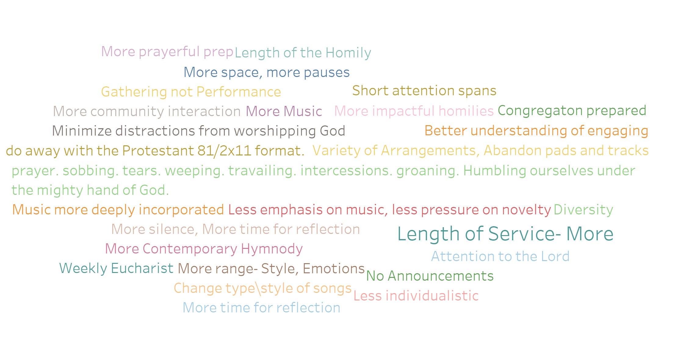 Worship leaders were asked about their desired changes in worship services. They expressed their hopes for both their local church and the wider Church, often connecting their local wishes to more encompassing desires. Their varied responses indicate their visions for the future of the Church, as what they felt needed to change in their services also needs to change overall. Several key ideas emerged and were echoed by other worship leaders from various denominations: