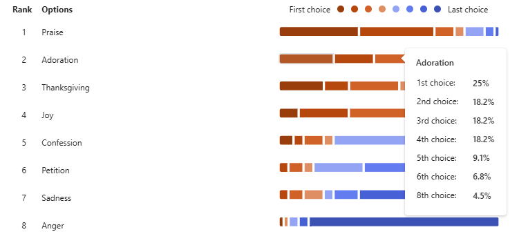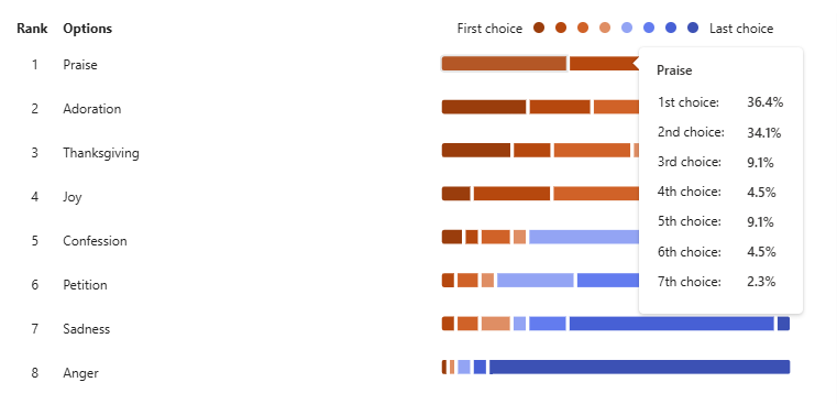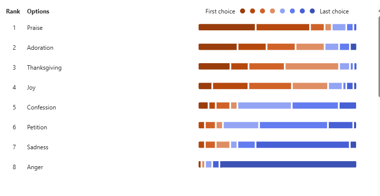I then quantified the answers, giving a total aggregate ranking of each emotion. If Praise was rated first, it would be assigned an 8, rated second a 7, and so forth. Adding those aggregated numbers together gives us a score, and we can compare them to the other emotions represented, while adding in what the worship leaders said quantifying their answers in the same manner.
