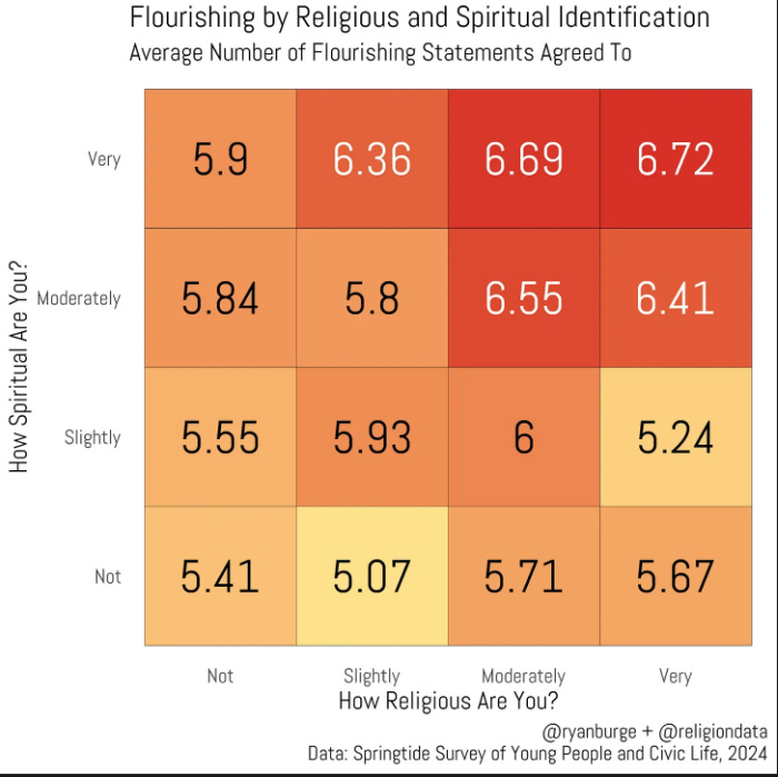 Last night while I took the dog out before heading to bed, I found myself scrolling through Ryan Burge’s Substack, Graphs about Religion. The name of his Substack is self-explanatory as he posts interesting graphs about various religious topics. The post, “Flourishing or Floundering? How Young People See Their Lives: And what role does religion and/or spirituality play in this,” caught my attention and I realized that it has some connection into what I am writing about here. Let’s first look at Burge’s data and then I’ll bring in the data from my research and make some comments about connections between the two.