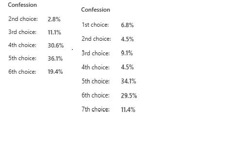 I cannot prove it with the data, but I am willing to speculate that churches believe that they are flourishing because the positive emotions are evoked and perceived to be evoked more in their services. It is interesting that Confession and Petition are usually reported to be in the middle to bottom, with Confession looking like this for the worship leaders (on the left) and the congregants (on the right):