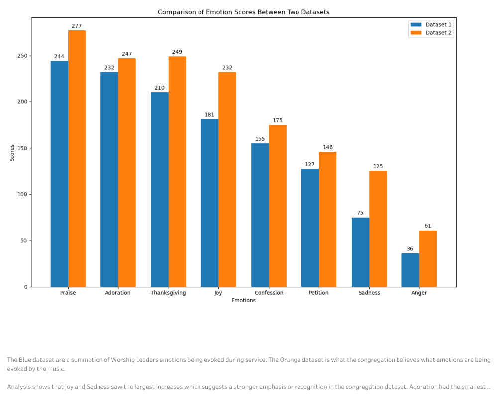 The blue lines are the responses of the worship leaders, and the orange lines are the responses of the congregants. The perceived mood of the worship services changed a little bit in the minds of the congregants, but it is not by a great margin. Adoration moved up slightly, overtaking Thanksgiving while most of the emotions held their relative positions, showing consistency in emotional prioritization.